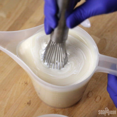 FIVE: Add roughly half the fragrance oil. Mix with a whisk.