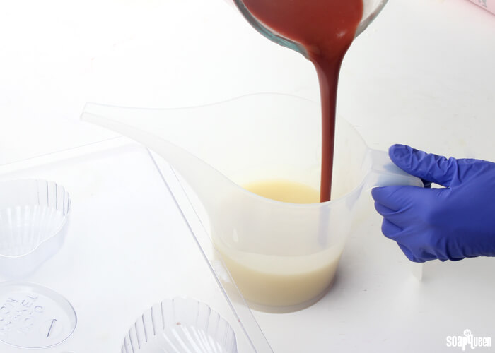 - Stir the uncolored batter to loosen the trace. Next, pour the pink batter into the uncolored batter in a circular pattern. Pour the batter from several inches above the other container, to make sure the pink soap breaks through down to the bottom of the container.