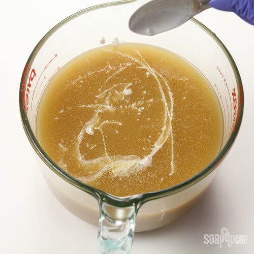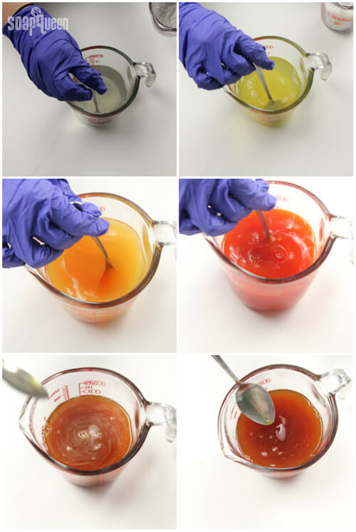 ONE: Slowly and carefully add the lye to the coconut water and gently stir until the lye has fully dissolved. Set aside to cool. Be aware: the lye will do some strange things! Check out this awesome progression of color as we added the lye to the liquid. You are watching the lye react with the sugars in the coconut water right before your eyes!