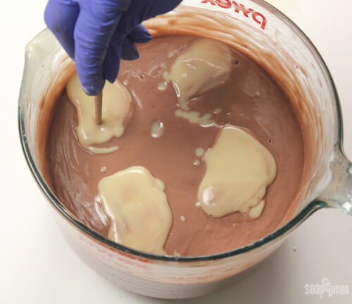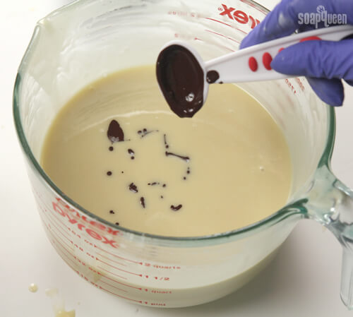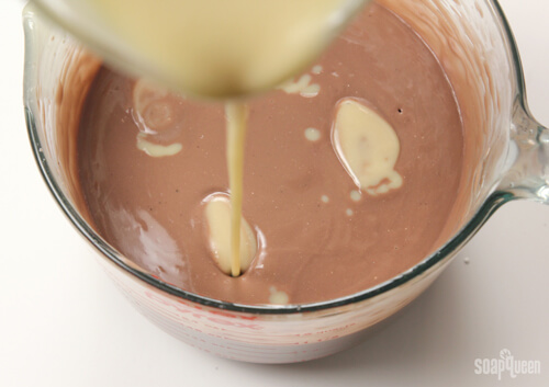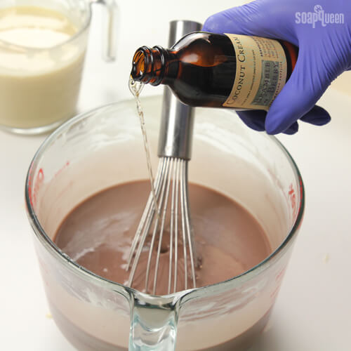 FIVE: The Coconut Cream Fragrance Oil will discolor soap to a light tan, so only add it to the dark brown soap to retain contrasting colors. Add 2 ounces (by weight) of Coconut Cream Fragrance Oil. Stir with a whisk to incorporate.