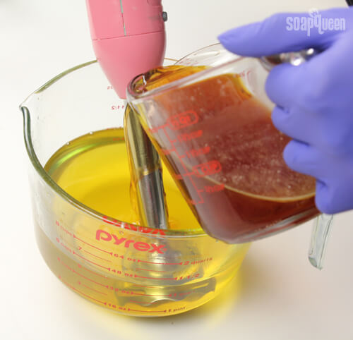 COLOR PREP: To ensure that the Titanium Dioxide blends smoothly into the soap batter, we recommend micronizing it before dispersing it in oil. To micronize colorant, simply use a coffee grinder to blend the colorant to break up any clumps of color and prevent streaks of white from showing in the final soap. I like to use a coffee grinder that has a removable, stainless steel mixing area for easy cleaning. Then, disperse 2 teaspoons of micronized Titanium Dioxide into 2 tablespoon of Sunflower or Sweet Almond Oil (or any other liquid oil). Finally, 1 teaspoon of Brown Oxide into 1 tablespoon of Sunflower or Sweet Almond Oil. Use a mini mixer to get the clumps of color worked out smoothly.