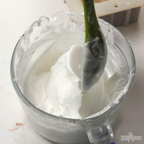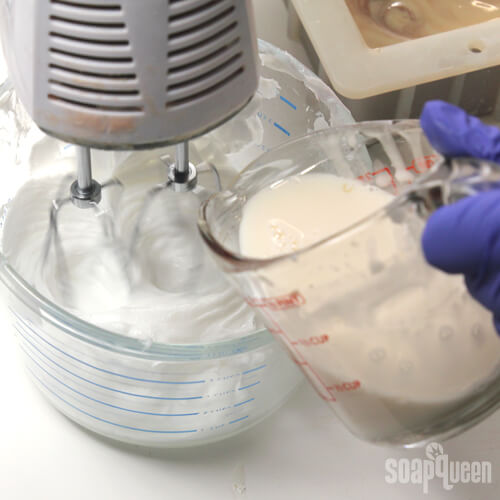 TEN: Add the White Melt and Pour to 16 ounces of Foaming Bath Whip. Using a hand mixer or stand mixer, Â whip the mixture until it can form stiff peaks (usually about 3 – 6 minutes of mixing).