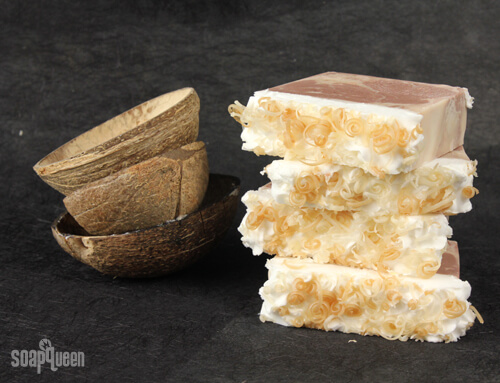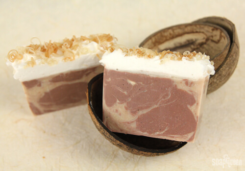 Made with 100% coconut water instead of distilled water, and featuring our brand new Coconut Cream Fragrance Oil, it’s a unique soap that smells as good as it looks. The top is finished off with melt & pour soap frosting and cold process “coconut flakes” to make this a truly decadent dessert soap.