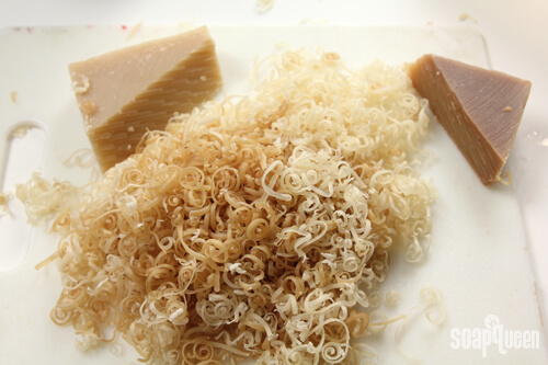TOPPING PREP: To achieve the look of toasted coconut flakes on top, grate two different leftover bars of brown & tan cold process soap with a cheese grater. This step is optional and completely up to you, but the shavings do add a nice pop!