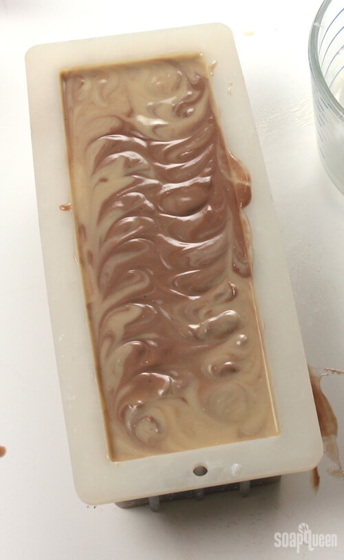 We used leftover tan and brown soaps we had in the lab. If you don’t have any lying around, you can skip this step or do two cold process soap loaves. You can do one with a little bit of Brown Oxide to get a tan color, and one with more to get a brown color. 🙂