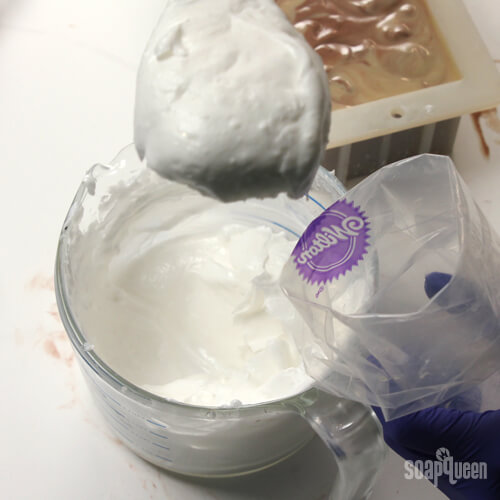 NINE: Now make the soapy frosting. Cut and melt 4 oz. of White Melt and Pour base in the microwave on 10 second bursts. Once melted, add 3 mL of Chipotle Caramel Fragrance Oil and 3 mL Vanilla Color Stabilizer. Stir to incorporate.