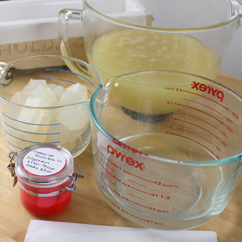 TWO: Melt 16 ounces of clear melt and pour soap in the microwave on 30 second bursts until fully melted. Then mix in your Bubble Gum colorant and fragrance oil. We dispersed Bubble Gum colorant in glycerin first (1 Teaspoon of colorant to 1/3 cup of glycerin). Add 2 Teaspoons of the colorant mixture and 1/2 oz of your fragrance oil blend. Give it a good mix and let it cool down to 135-140 degrees.
