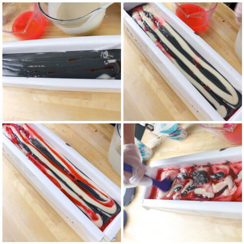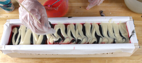 TEN: Once you’ve swirled the entire soap loaf it’s time to make the top look beautiful. Pour the black soap in the opposite direction that you did earlier (so you’re going to go back and forth 13 or 14 times the width of the mold. Repeat with the white soap on top of the black soap. Run your skewer through the top of the soap the long way to create a swirled look on the top.