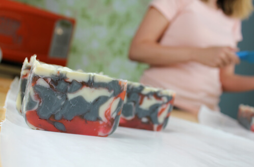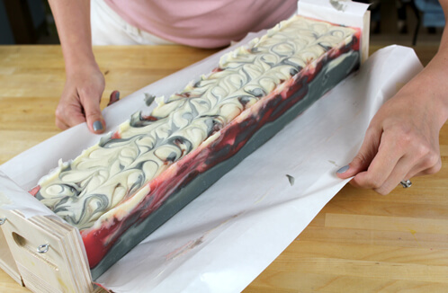This free flowing, lava like design inspired the name for this project. Magma Soap is an intricate project with so many possibilities. I’ve combined melt and pour soap with cold process soap to create a uniquely fascinating bar.