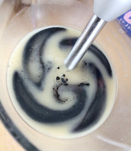 SEVEN: Add a heaping 1/4 Teaspoon of Activated Charcoal to the other half of the soap batter. Mix with a stick blender until the charcoal is fully incorporated. Because I mixed the light colorant first you won’t need to wash your stick blender. This is such a handy trick that I use all the time. Get me out of doing dishes and I’m in!
