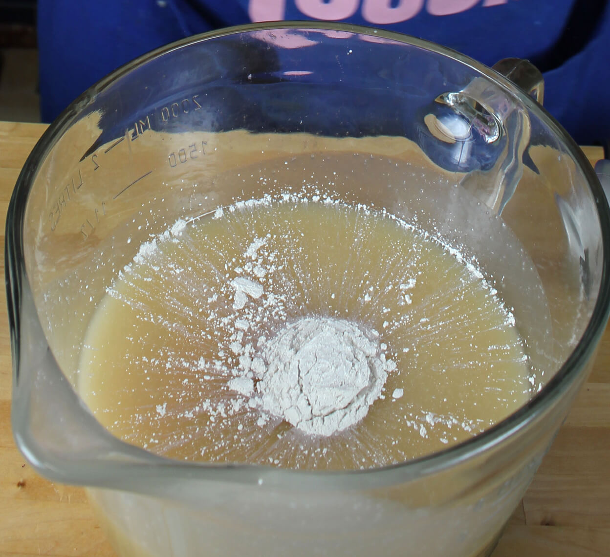ONE: Carefully combine your water and lye and mix well. Always remember to add the lye to the water and not the other way around. Stir until mixture becomes clear and make sure you are in a well ventilated area. Set the lye water aside to cool.