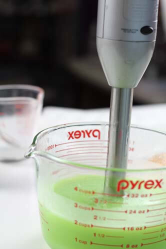 FOUR: Pulse the mixture with your stick blender until you reach trace. Add 5 ml diluted Citrus Green LabColor and stick blend until incorporated.