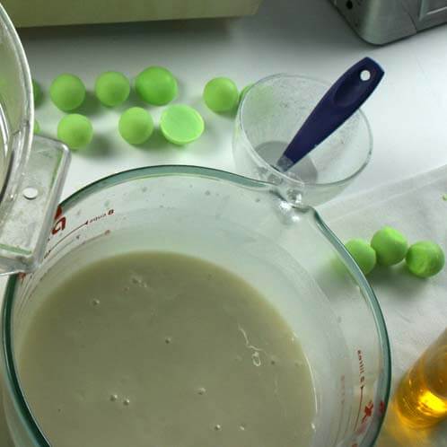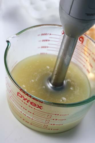 TIP: To prevent air bubbles when adding the lye water, pour over a spatula or down the shaft of your stick blender.