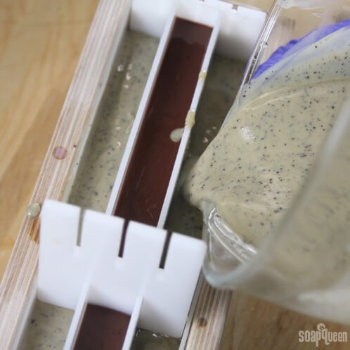 EIGHT: Gently pour the brown soap into the center of the Multi-Pour Sectioning Tool. To help the soap batter evenly spread throughout the middle section, you can alternate pouring from each end.