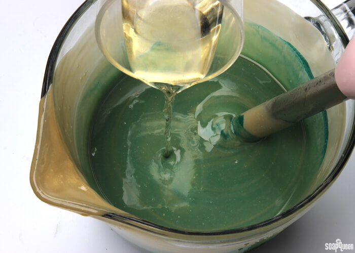 COLOR PREP: To ensure that the Titanium Dioxide blends smoothly into the soap batter, we recommend micronizing it before dispersing it in oil. Please note this is an optional tip but it does help with the titanium dioxide clumping in the soap =) To micronize colorant, simply use a coffee grinder to blend the colorant to break up any clumps of color and prevent streaks of white from showing in the final soap. We like to use a coffee grinder that has a removable, stainless steel mixing area for easy cleaning. Then, disperse 1 teaspoon of the colorant into 1 tablespoon of sunflower or sweet almond oil (or any other liquid oil). Disperse 1 teaspoon Hydrated Chrome Green Oxide into 1 tablespoon lightweight liquid oil. Use a mini mixer to work out any clumps.