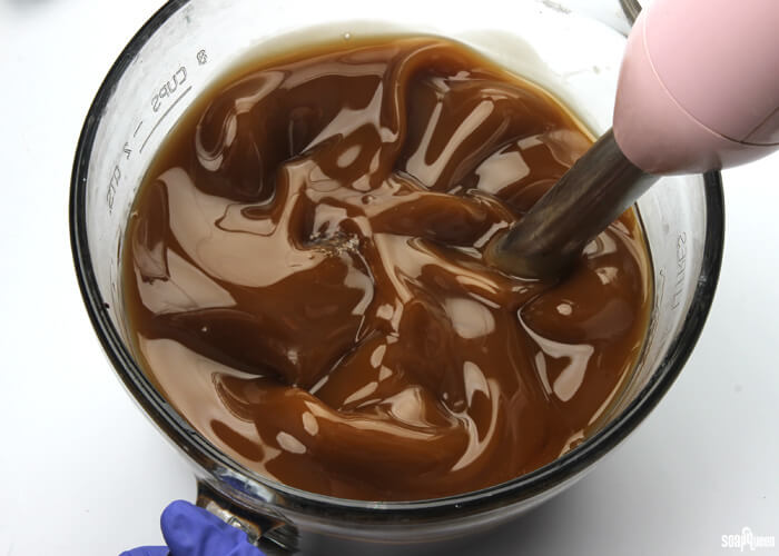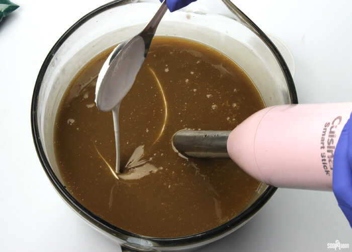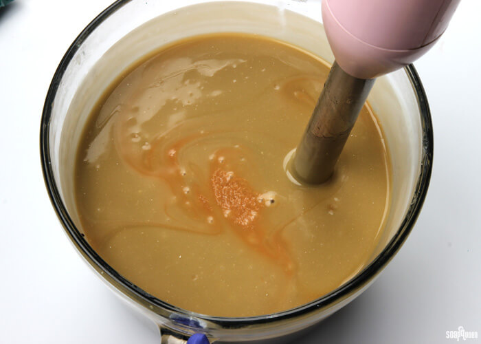- Add 1 tablespoon dispersed Titanium Dioxide to the entire mixture. Use the stick blender to mix in the colorant, alternating between pulsing and stirring with the blender. As you stick blend, the color will become lighter but will still be a tan color. Don’t worry! The color will continue to lighten as it hardens in the mold.