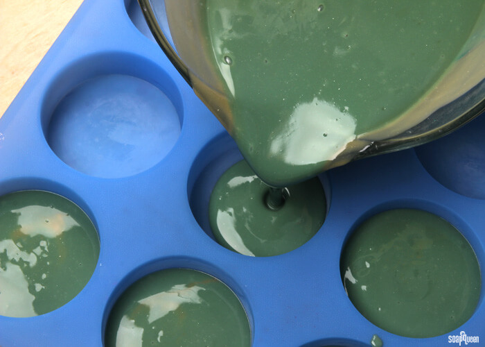 - Place the mold onto a large cutting board to help transfer the mold later. Pour the green soap into the cavities, filling each about halfway. Use the cutting board to tamp the mold onto the counter to help release any air bubbles.