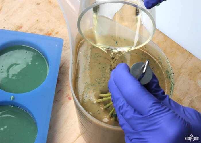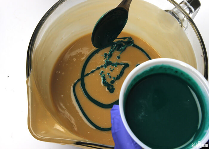 Most cold process recipes on Soap Queen are formulated at 5% superfat. Superfat refers to the percentage of oil that is not turned into soap by the lye. Click here to see a visual representation of the saponification process, along with the concept of superfat. In my experience, I find that a 5% superfat is extremely skin-loving, while still firm and easy to unmold. Because of the extra oil in the green tea extract and colorants, I decreased the superfat to 3% in this recipe to aid in unmolding. Keep in mind that a 0% superfat is a perfectly balanced bar of soap! Less than 5% superfat is not a dangerous or bad thing. =)