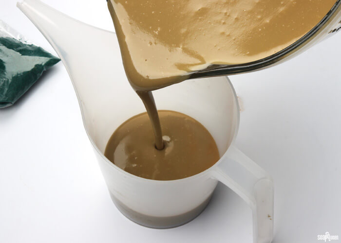 - Slowly and carefully add the lye to the green tea water and gently stir until the lye has fully dissolved. The mixture will be a brown color. Set aside to cool.