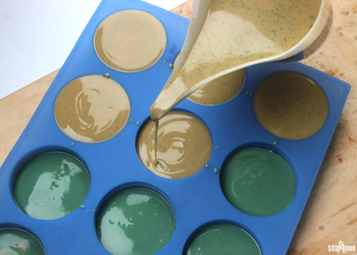 - Slowly and carefully, pour the soap into each cavity, on top of the green layer. Pour gently so you do not break through the green layer below.
