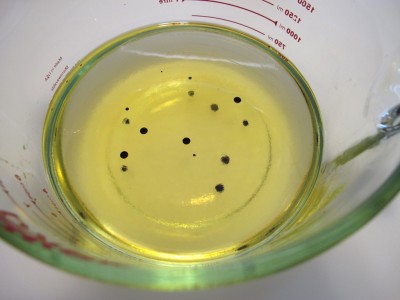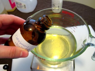 1. Make your lye water solution. Weigh out and melt the Coconut Oil and Shea Butter. Add the liquid oils to the melted oils. Add the fragrance oil and fuchsia color to the melted oils.