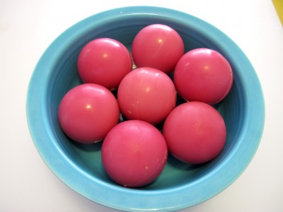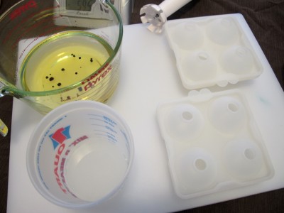 2. Get everything ready to go.  You should have your melted oil (with fragrance and color), the lye solution and two sphere molds.