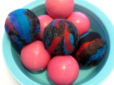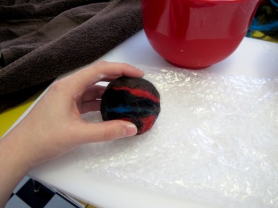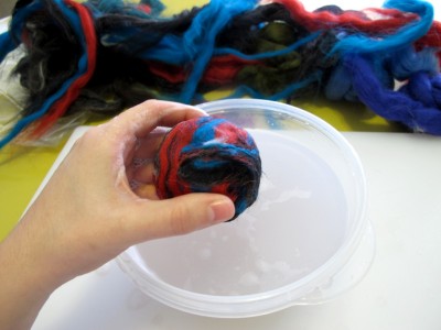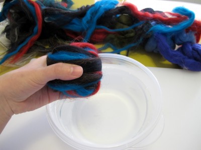 6. Adorable!  And even more adorable felted!  So let’s make some cute felted soap balls!Let your soap balls cure at least three weeks before you felt them.  You will need some wool roving.  Make sure its the kind that shrinks down and felts.  Look around locally and see what you can find. Pull the wool into thin pieces as shown below if you want to create a striped pattern.  If you don’t…just use single colors similar in size as shown below.