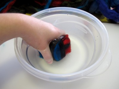 9. Bring it out after it is completely wet.  Then start squeezing and patting.  You don’t want to rub at this point or it will move your fibers around too much.  Dunk again.  Squeeze and pat some more.  It should start felting.