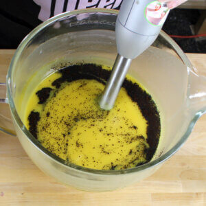 FIVE: To the first half of soap batter, add 2 tablespoons of ground coffee and mix well with the stick blender until you reach thick trace. Pour the soap batter into the mold.