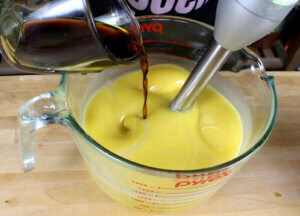 THREE: Slowly and carefully add the lye water to the oil mixture. Stick blend until light trace. Add essential oil combination and stick blend until trace.