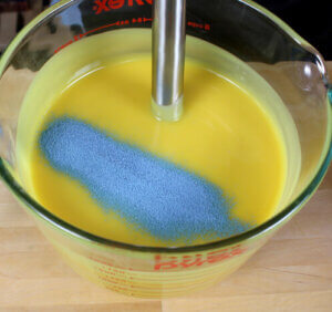 SIX: Add 2 tablespoons of Blue Pumice to the second half of the batter and mix until thick trace. Pour the second layer of soap.