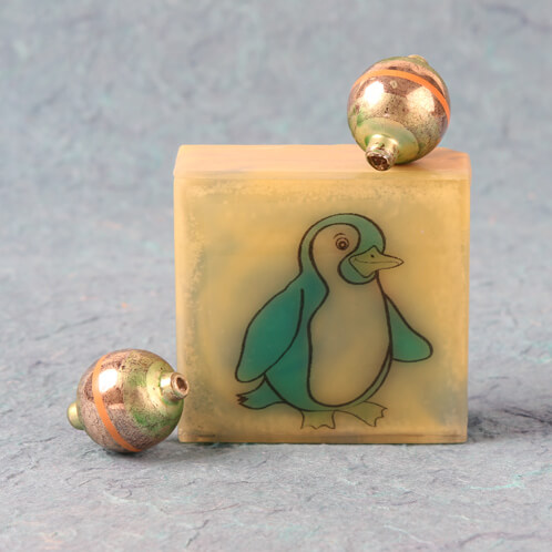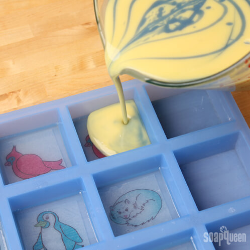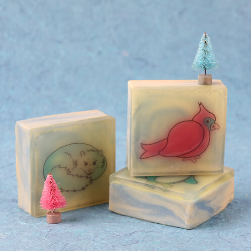 This project combines the beautiful swirls you can achieve easily with cold process soap and the ability to layer designs in melt & pour. You can print out these cute holiday creatures from this template on water soluble paper and layer them on your soap to give your finished soaps some whimsical character.