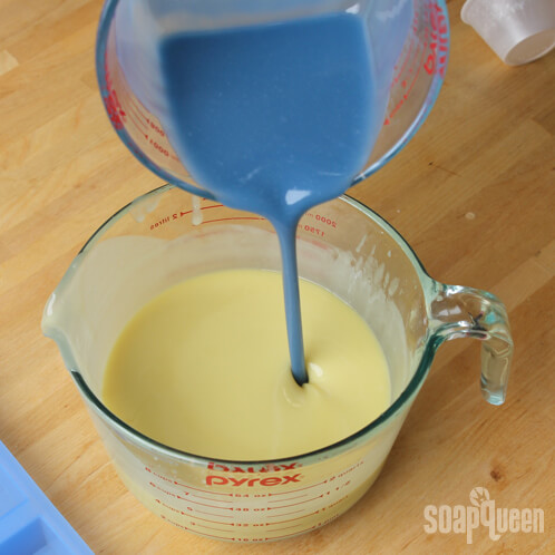 FIVE: For the in-the-pot swirl, start by pouring the 1982 Blue colored soap into the Super Pearly White colored soap beginning on the outer edge of the soap container and spiraling in towards the center. Pour from a high point so that the soap penetrates the entire depth of the soap in the pot, which will create a swirl throughout the soap.