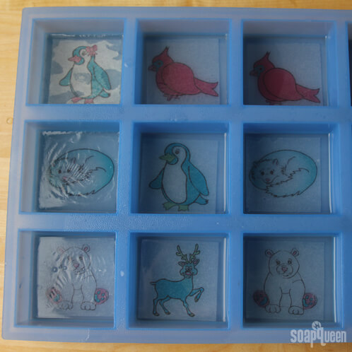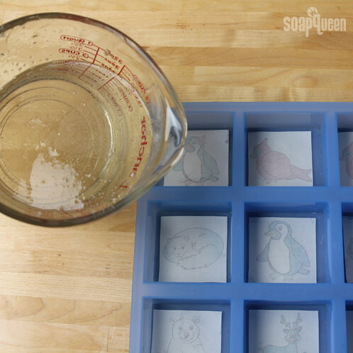 PREP: Print out the Holiday Animal Design on water soluble paper. If using an inkjet printer, print out the design a couple of days before you intend to make the soap. Then lightly spray the design with an aerosol hair spray to help prevent the colors from bleeding.