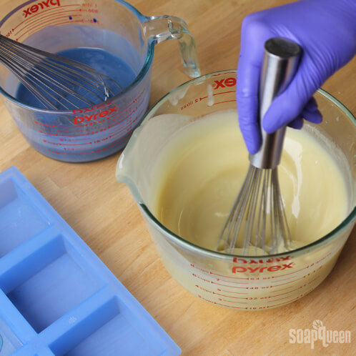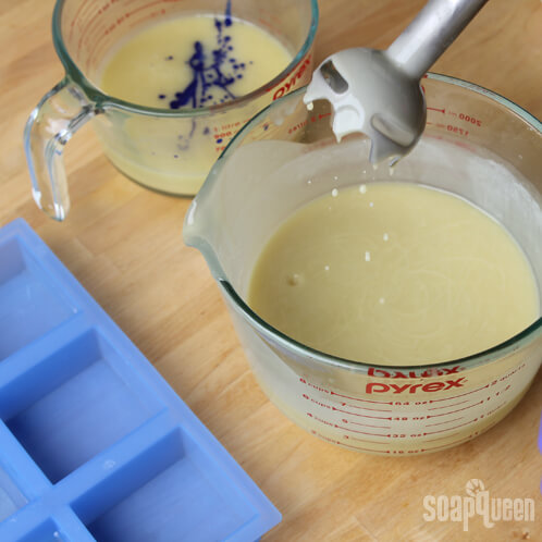 COLOR PREP: Disperse 1 teaspoon of 1982 Blue into 1 tablespoon of liquid oil (we like Sweet Almond or Sunflower oils). Disperse two teaspoons of Super Pearly White in 2 tablespoons of liquid oil. Prepping your colors in the beginning will allow you to work quickly and give you more time to work with your soap. Use the mini mixer to get all those clumps worked out smoothly.