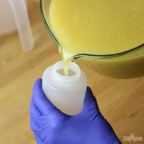 - Pour approximately 2 – 3 oz. of soap batter into a condiment bottle and color with 1 teaspoon of dispersed Hydrated Chrome Green. Plug the tip with your finger and then shake vigorously. Release your finger with the tip pointing away from your face and then set aside.