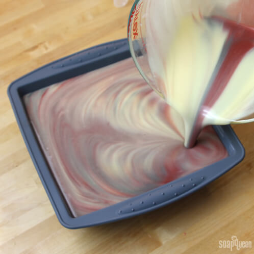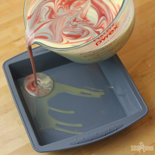 - After you’ve swirled the soap, slowly pour the batter into the mold. We started pouring in the upper left hand corner and moved diagonally to the bottom right hand corner.