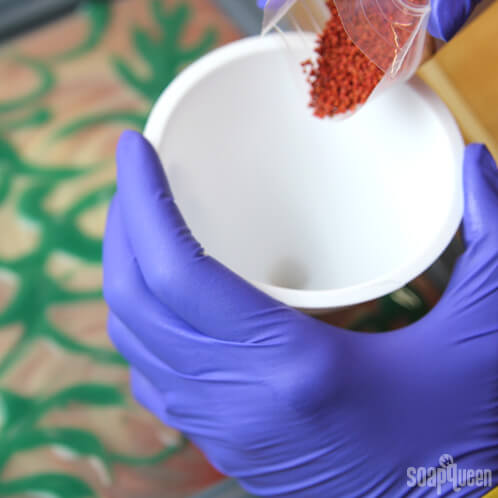 - COLOR PREP: To ensure that the Titanium Dioxide blends smoothly into the soap batter, we recommend micronizing it before dispersing it in oil. Please note this is an optional tip but it does help with the titanium dioxide clumping in the soap =) To micronize colorant, simply use a coffee grinder to blend the colorant to break up any clumps of color and prevent streaks of white from showing in the final soap. We like to use a coffee grinder that has a removable, stainless steel mixing area for easy cleaning. Disperse 1 teaspoon all colorants except the Super Pearly White into 1 tablespoon of liquid oil (we like Sweet Almond or Sunflower). Make a double batch of the Super Pearly White by mixing two teaspoons of colorant into 2 tablespoons of oil. Prepping your colors in the beginning will allow you to work quickly and give you more time to work with your soap. Use the mini mixer to get all those clumps worked out smoothly.