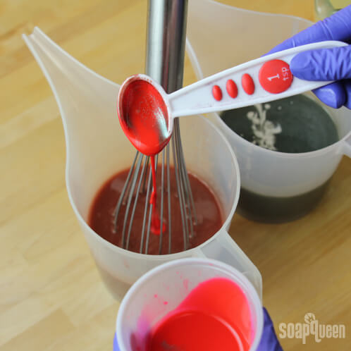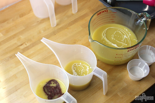 - Add the following colorants to the three containers:<br>2 teaspoons dispersed Super Pearly White in the original container.<br>3 teaspoons dispersed Merlot Sparkle Mica and 1/2 teaspoon Electric Bubblegum in one of the 2-cup containers.<br>3 teaspoons dispersed Super Pearly White and 1/4 teaspoon dispersed Activated Charcoal in the remaining 2-cup container.