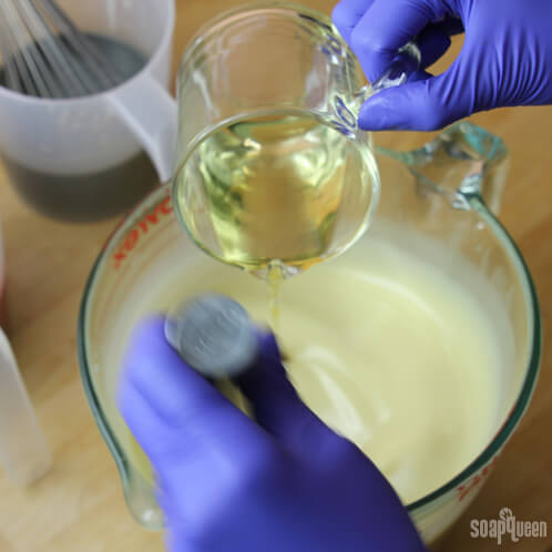 TWO: Begin by melting down the Palm Kernel Flakes in the microwave on 30 second bursts. Then, combine the melted Palm Kernel Flakes with the melted Avocado Butter, Coconut Oil, Olive Oil, Palm Oil, Rice Bran Oil and Sweet Almond Oil in a large glass container. Once the lye water and the oils have cooled to 130 degrees or below (and are ideally within 10 degrees of each other), add the lye water to the oils and stick blend until thin trace.