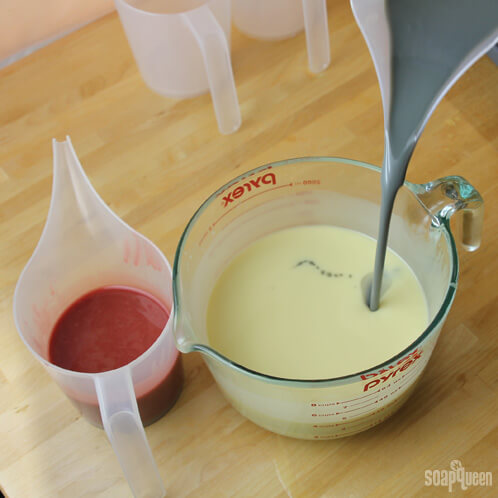 - For the in-the-pot swirl, start by pouring the grey colored soap into the Titanium Dioxide colored soap in 4 places: 12:00 o’clock, 4:00 o’clock, 8:00 o’clock, and center. Repeat with the Merlot Sparkle Mica. Pour from a high point so that the soap penetrates the entire depth of the soap in the pot, which will create a swirl throughout the soap.