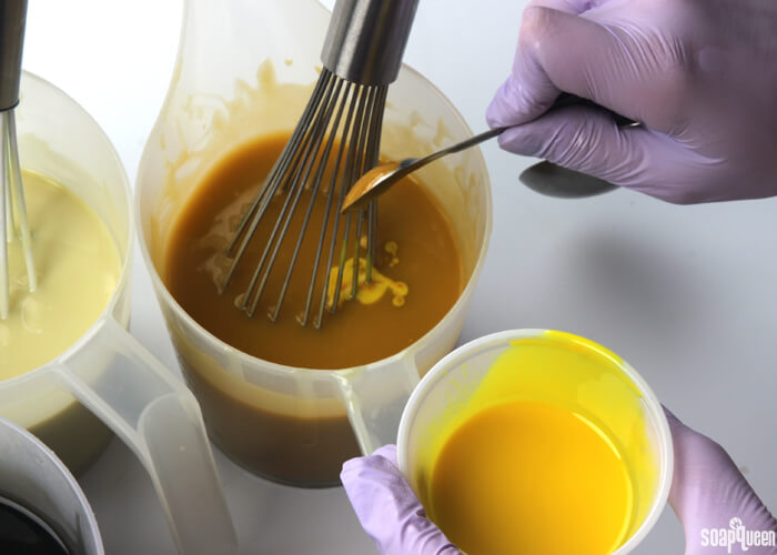 For example, you usually disperse 1 tsp colorant in 1 Tbs oil, and then use a small amount of that mixture. Like above in this part “Container C: 1 tsp. dispersed Yellow Oxide + 1 tsp. dispersed Fizzy Lemonade Colorant”.