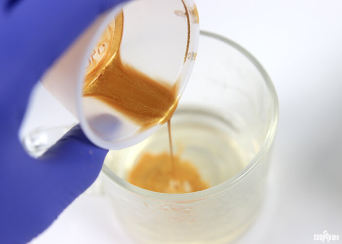 - Add 2 teaspoons of dispersed King’s Gold Mica and 3/4 tsp. of dispersed Copper Sparkle Mica to the soap and mix well.