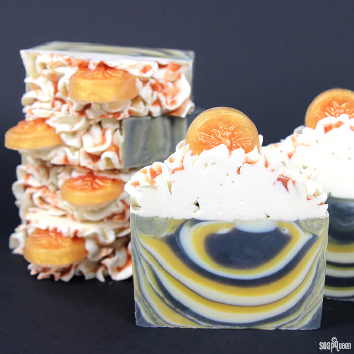 This soap is made using the funnel pour technique. Yellow, white and black soap is poured through a funnel, creating the unique layers. Check out this Funnel Pour Soap video on Soap Queen TV to see how it’s done.