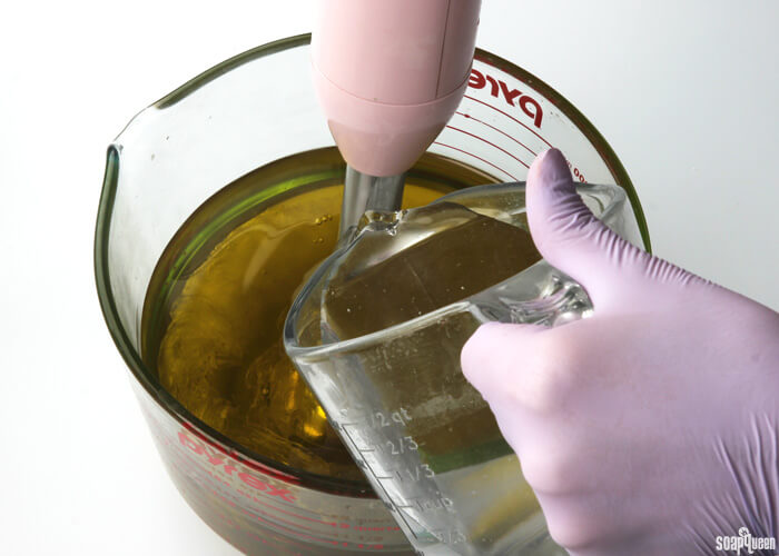 ONE: Slowly and carefully add the lye to the water and gently stir until the lye has fully dissolved and the liquid is clear. Set aside to cool.
