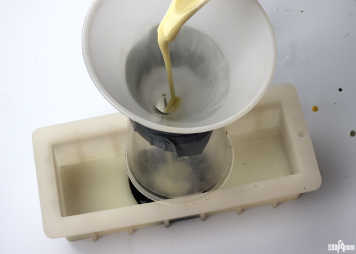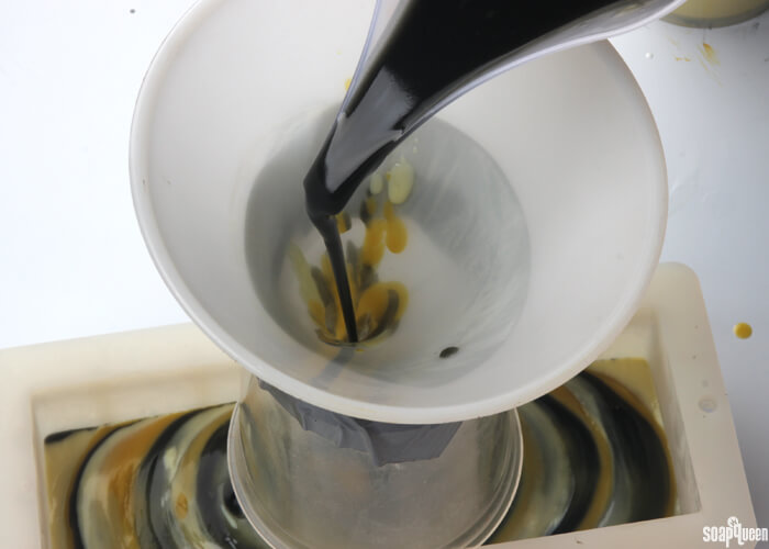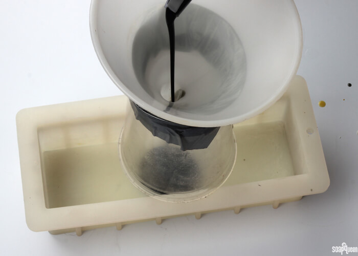 FIVE: Pour the black soap into the funnel. We like to count to 3 to ensure even pours. Check out the Funnel Pour Soap video on Soap Queen TV to see how to do the technique step by step.