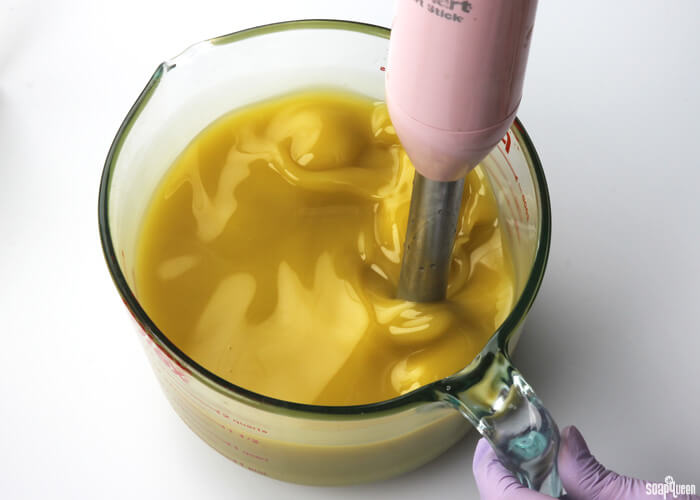 We typically whip the oils for 30 seconds to 1 minute before adding the lye. That helps loosen the oils up a little, helping that lye mix in fully. How long you whip the soap depends on how cool it is. We whipped for about 15 minutes total in our Soap Lab, which was very hot that day. Sometimes, it can take as little as 5 minutes. Just whip until the soap is thick enough to hold its shape. 🙂