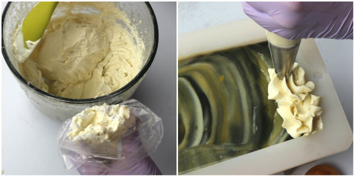 FOUR: Starting at the end of the mold, begin piping dollops of frosting. We got about three dollops per row.