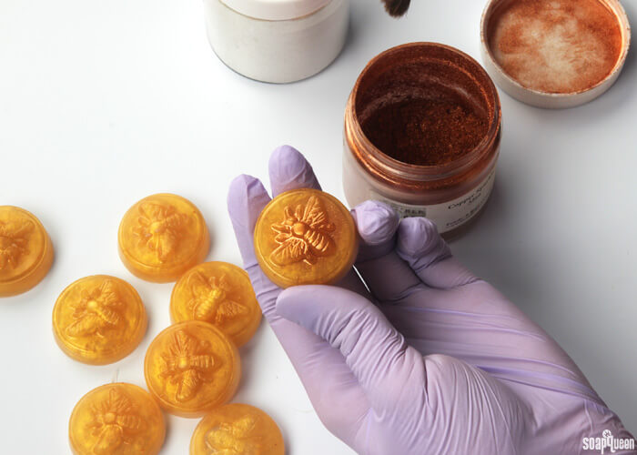TWO: Carefully pour the melt and pour into the Honey Bee Wax Tart Mold cavities, filling each cavity about half way. Spritz with 99% isopropyl alcohol to disperse any bubbles, and allow to fully cool and harden. Remove from the mold. To really make the embeds pop, use a paintbrush to dust a thin coat of Copper Sparkle Mica on the bee image.