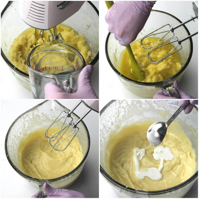 - Slowly pour the lye into the whipped oils, and use a spoon to incorporate. Be super careful not to splash any lye at this point before the lye water is fully incorporated into the hardened, slushy, cool oils. Turn the hand mixer or Kitchen Aid Stand Mixer on low, and continue to whip oils until a fluffy, frosting texture is achieved. Scrape any batter that has splattered on the side of the container and then turn the mixer to a medium setting. Continue to whip for another 3-7 minutes.